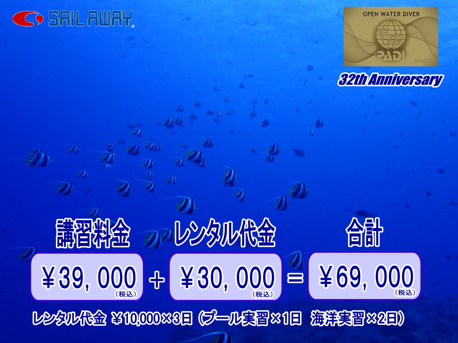 | ≪講習料金に含まれるもの≫ 学科講習費 プール実習費 海洋実習費 教材費 施設使用料 入海料 Cカード申請料 プール・海洋現地までの往復交通費 保険料 器材レンタル代 ≪講習料金に含まれないもの≫ 海洋実習宿泊コースご希望の方¥8,800 ※視力の弱い方はお問い合わせください。 ≪レンタル代金詳細≫ 軽器材セット ¥3,000/1日 重器材セット ¥7,000/1日 合計 ¥10,000×3日 講習中に当店にてダイビング器材をご購入された場合 使用していないレンタル代金は返金させていただきます |